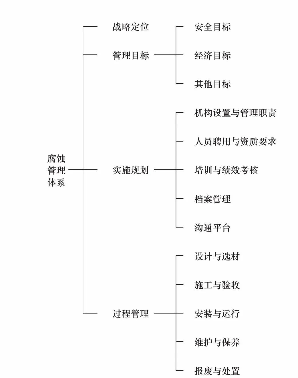 為了更好地管理腐蝕問(wèn)題,應(yīng)建立一套完善的、具有廣泛適用性的系統(tǒng)的管理體系,通過(guò)組織的目標(biāo)、制度、程序等來(lái)管理腐蝕問(wèn)題,指導(dǎo)組織的腐蝕管理工作。腐蝕管理體系內(nèi)涵豐富,要在實(shí)踐的過(guò)程中不斷發(fā)展完善[1,4,5]。