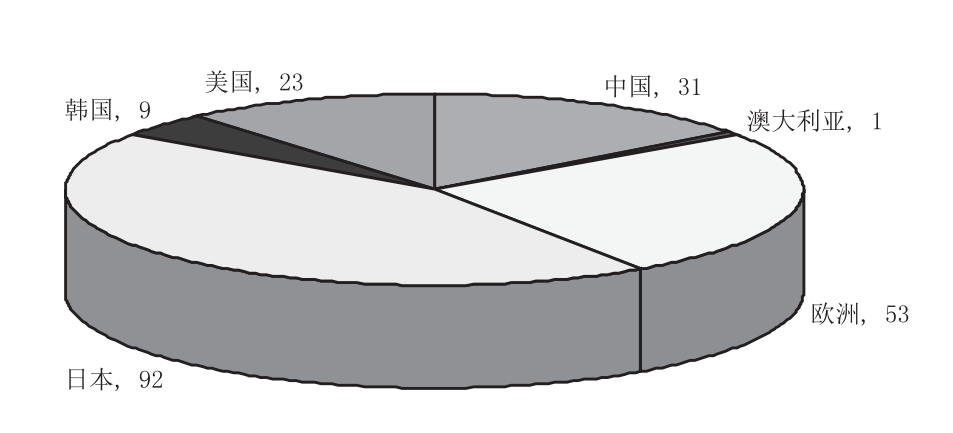 1996 年 1 月 1 日至 2016 年 12 月 1 日,涉及低表面能有機硅船舶防污涂料技術的國內外專利共有 209 件,圖 1 是各國申請人申請量分布圖,從圖中可以看出, 日本的申請數量為 92 件,居于首位,其次是歐洲 53 件, 中國 31 件,美國 23 件。