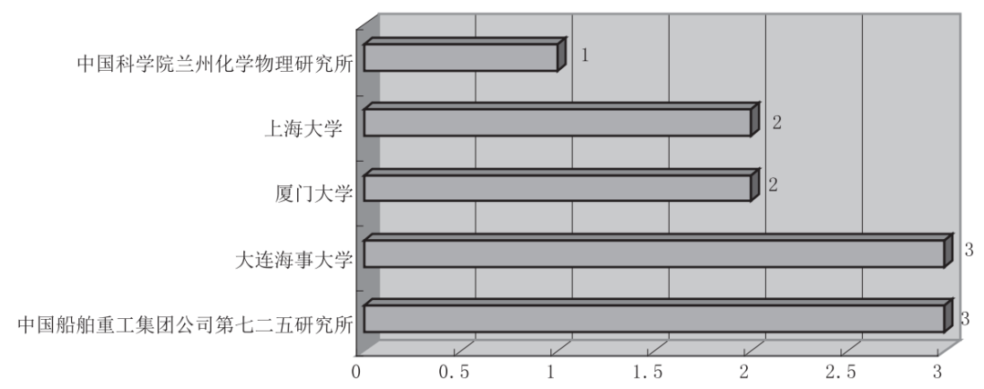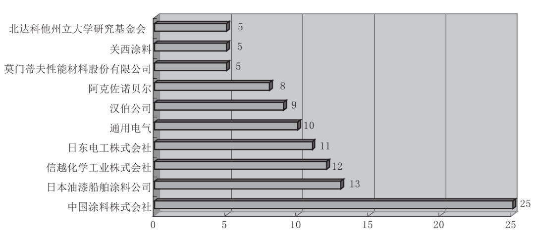 國內申請中各個申請人的申請量均不高,且集 中在中國船舶重工集團公司第七二五研究所、大連 海事大學等研究機構、高校中,企業申請較少,可市場化應用的產品也較少,而國外企業已有大量成熟的產品占領市場,例如中國涂料株式會社的 Seajet 2000、 漢 伯 公 司 的 Hempasil SP-EED 77100 等、關西涂料的 Captain Biox 系列產品,擁有自主知識產權的低表面能有機硅船舶防污涂料產品對國內企業來說已迫在眉睫。