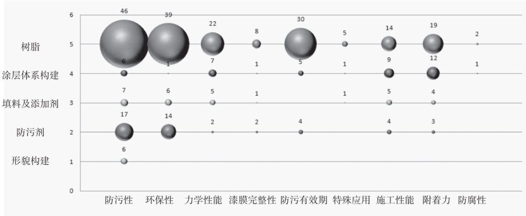 對 209 件專利申請進行分析和梳理后,對其中主 要的技術功效進行分析,圖 5 是低表面能有機硅船舶防污涂料技術功效分布圖。